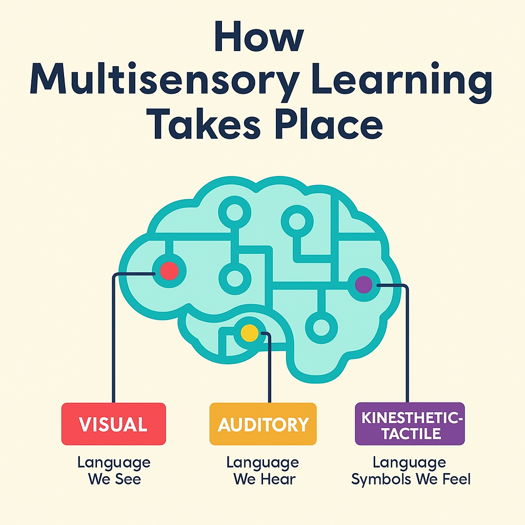 We link the visual (seeing), auditory (hearing), and kinesthetic (touch/movement) pathways in the brain. This approach helps solidify new knowledge and makes learning stick.